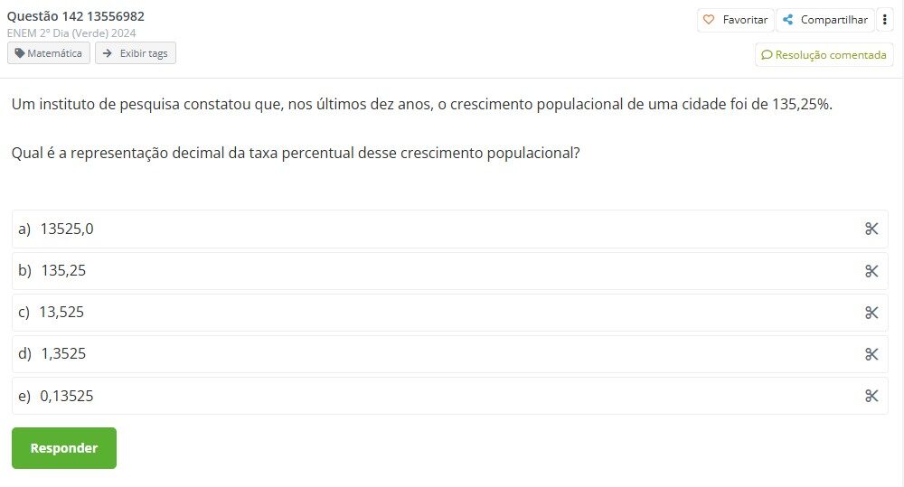 Assim, a representação decimal de 135,25% é 1,3525. Portanto, a resposta correta é 1,3525, que é a forma decimal da taxa de crescimento populacional.
